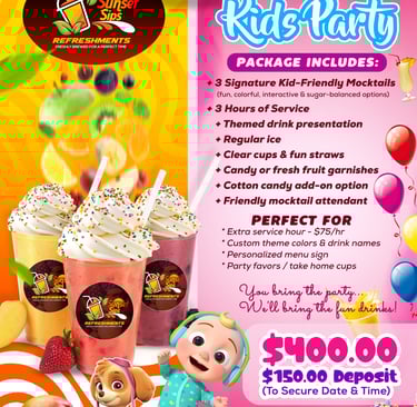 Make your children’s parties extra fun, colorful, and memorable with our specially designed Kids Party Theme Sections. At our mobile bar, we create exciting, child-friendly setups that combine delicious natural fruit juices with playful themes that kids love.